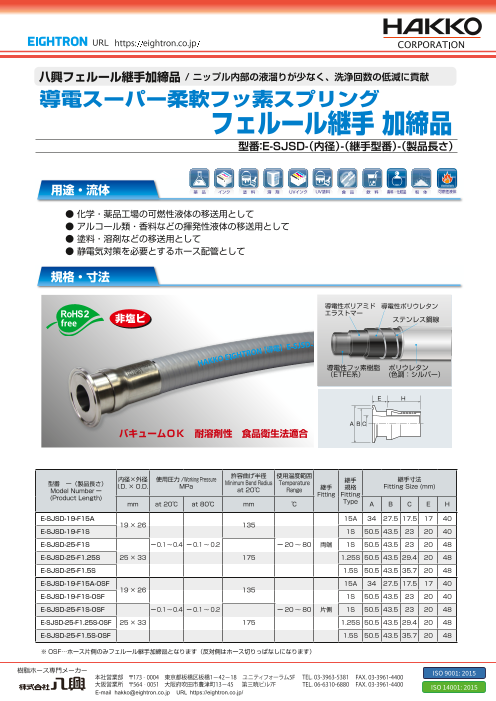 導電スーパー柔軟フッ素ホースシリーズは、静電気を帯びると危険な可燃性液体の移送に適した耐薬品性と導電性を兼ね備えた新しいホースです。 1.業界初!可燃性液体が流せる耐薬品性&静電気対策用ホース 2.2013年に静電気のガイドラインが新たに制定され、従来の...