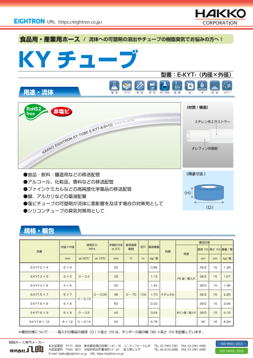 ホースを柔らかくする可塑剤を一切使用していないオイルフリーの非塩ビ耐圧ホース 軟質塩ビホースやゴムホースの臭気、溶出物のお困りごとを改善できます。 ●食品・飲料・醸造用として ●アルコール・化粧品・香料などの移送用として ●ファインケミカルなどの...