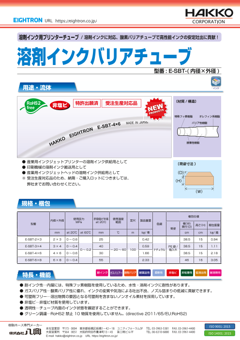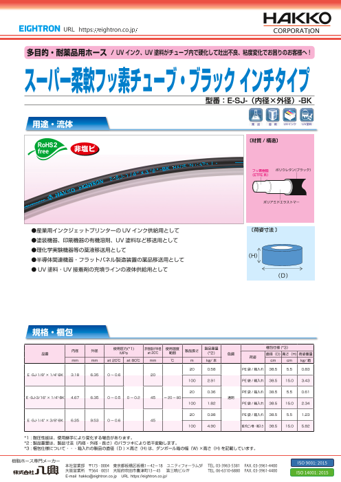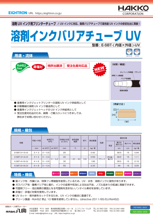 産業用インクジェットプリンターのインク配管、UV硬化型接着剤を流すチューブとして最適です。 内層4フッ化フッ素樹脂(ETFE)+外層遮光性TPUの積層型チューブ。 国内外のインクジェットプリンターヘッドメーカー、UVインクの反応性希釈剤メーカー、プリ...