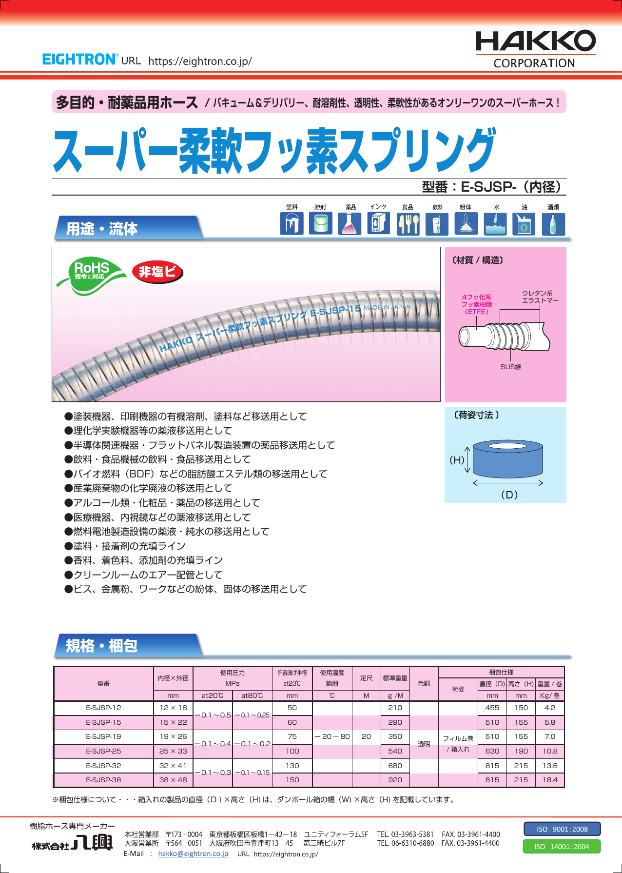 透明性と耐薬品性と柔軟性を有し、負圧で圧送でも使用できるため、幅広い用途で採用されています。 ●塗装機器、印刷機器の有機溶剤、塗料など移送用として ●理化学実験機器等の薬液移送用として ●半導体関連機器・フラットパネル製造装置の薬品移送用として ...