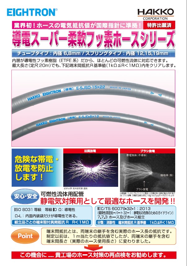 導電スーパー柔軟フッ素ホースシリーズは、静電気を帯びると危険な可燃性液体の移送に適した耐薬品性と導電性を兼ね備えた新しいホースです。 1.業界初!可燃性液体が流せる耐薬品性&静電気対策用ホース 2.2013年に静電気のガイドラインが新たに制定され、従来の...