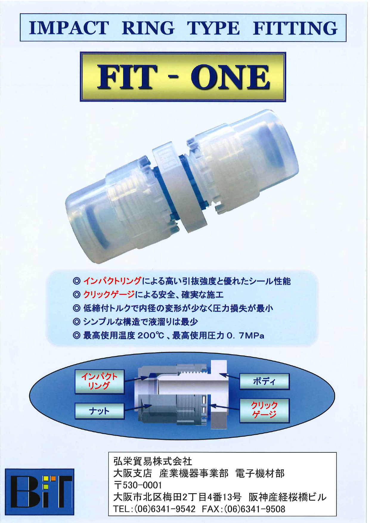 インパクトリングによる高い引抜強度と優れたシール性能 クリックゲージによる安全、確実な施工 低締付トルクで内径の変形が少なく圧力損失が最小 シンプルナ構造で液溜りは最小 最高使用温度200℃、最高使用圧力0.7MPa