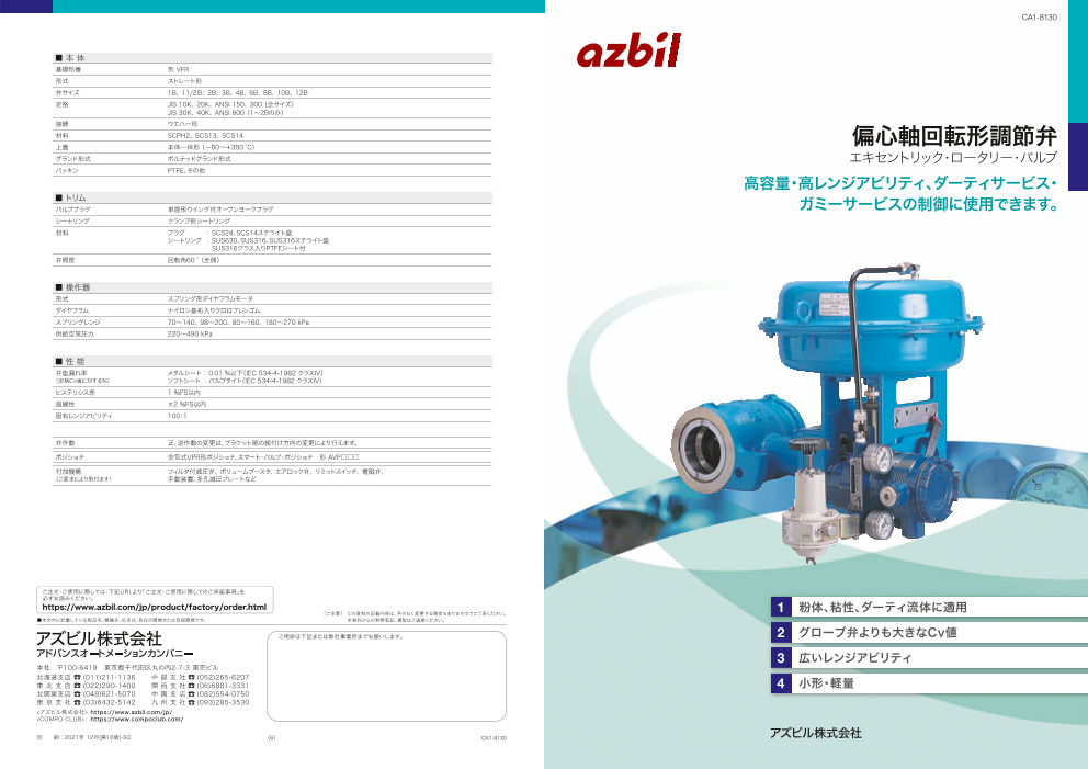 1粉体、粘性、ダーティ流体に適用 2グローブ弁よりも大きなCv値 3広いレンジアビリティ 4子形・軽量