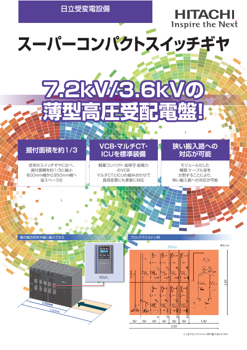 同製品の特徴 ・据付面積を約1/3 ・VCB、マルチCT、ICUを標準装備 ・狭い搬入路への対応が可能 詳細仕様などについては、カタログダウンロードいただきご確認ください。
