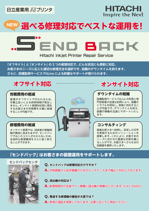 「オフサイト」と「オンサイト」の 2 つの修理対応で、どんな状況にも柔軟に対応。 お客さまのニーズに応じた適切な修理方法を選択でき、設備のダウンタイムを抑えます。 さらに、設備監視サービス FitLive による的確なサポートが受けられます。 ...