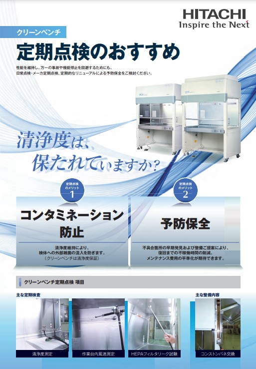 性能を維持し、万一の事故や機能停止を回避するためにも、日常点検・メーカ定期点検、定期的なリニューアルによる予防保全をご検討ください。 ◆定期点検のメリット1 コンタミネーション防止 清浄領域確保により、検体への外部雑菌の混入を防ぎます。(クリーン...