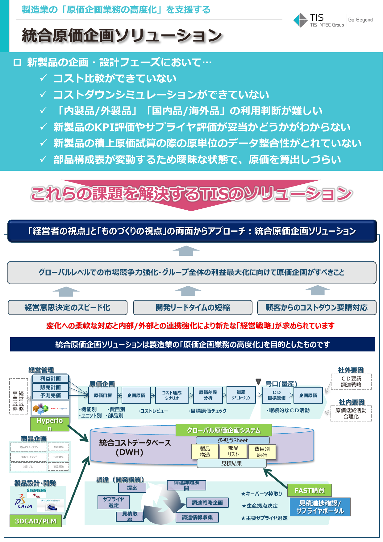 統合原価企画ソリューションは製造業の「原価企画業務の高度化」を目的としたものです。 「経営的視点」と「ものづくりの視点」の両面からアプローチします。