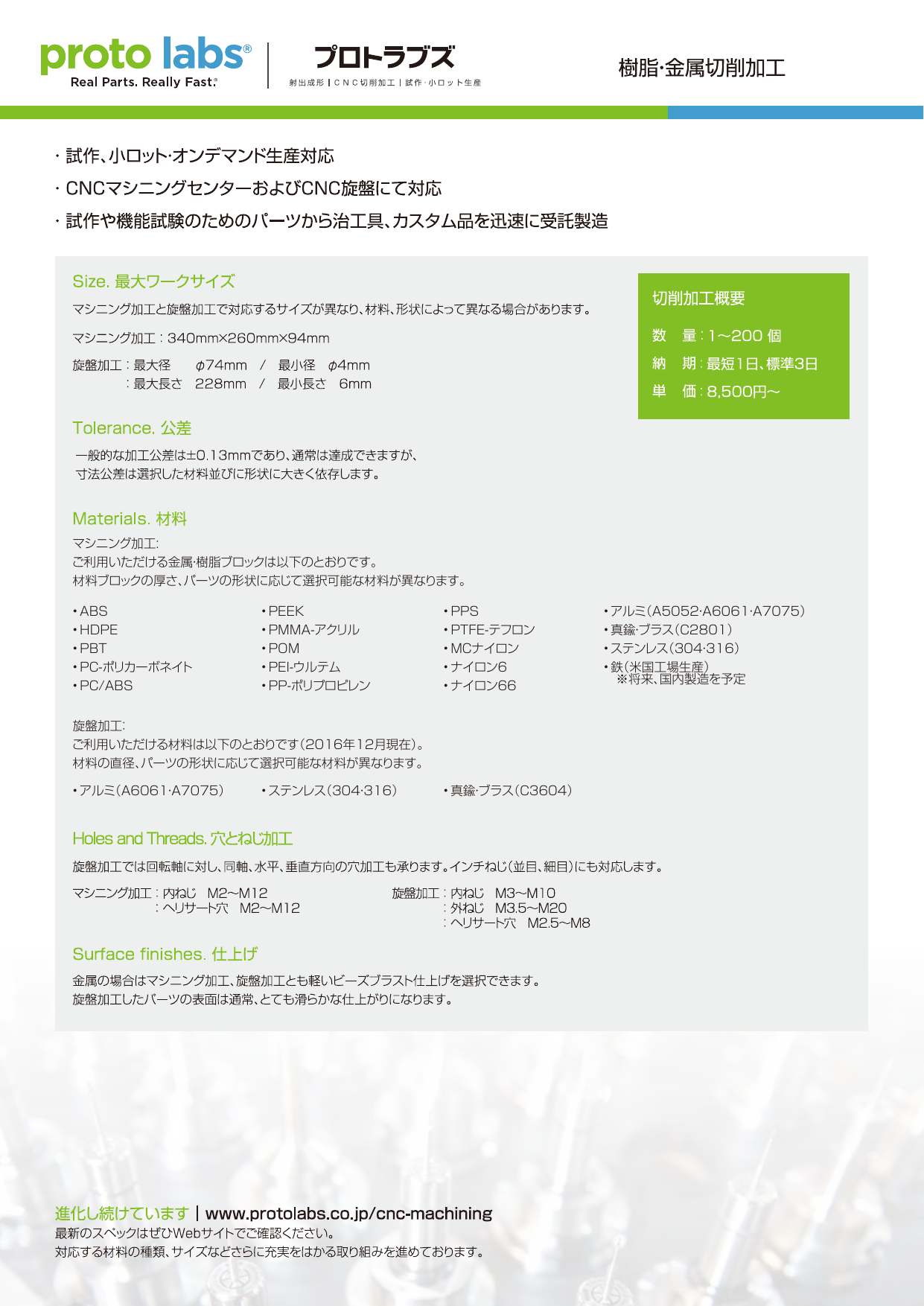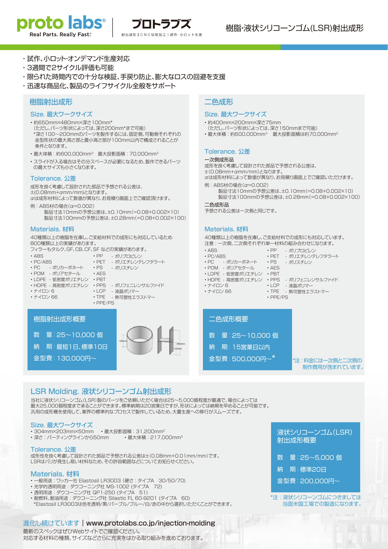 ■プロトラブズが展開する事業 ・樹脂・液状シリコーンゴム(LSR)射出成形 ・CNC切削加工 ・試作・小ロット生産 ■プロトラブズが選ばれる理由 1.限られた時間を短納期でサポート 2.パーツ製造性の向上 3.リスクの軽減 ■プロトラブズ...