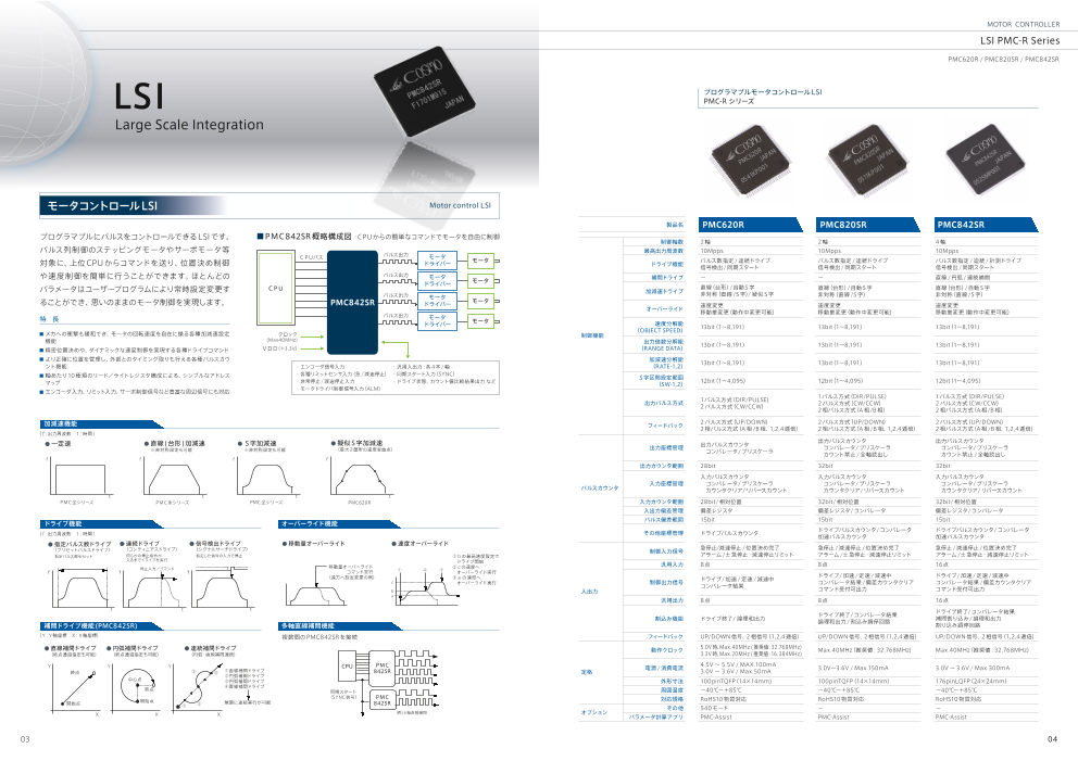 コスモテックスが開発したモータコントロールLSIの機能についての紹介と、 プログラマブルモータコントロールLSI「PMC-Rシリーズ」の仕様について