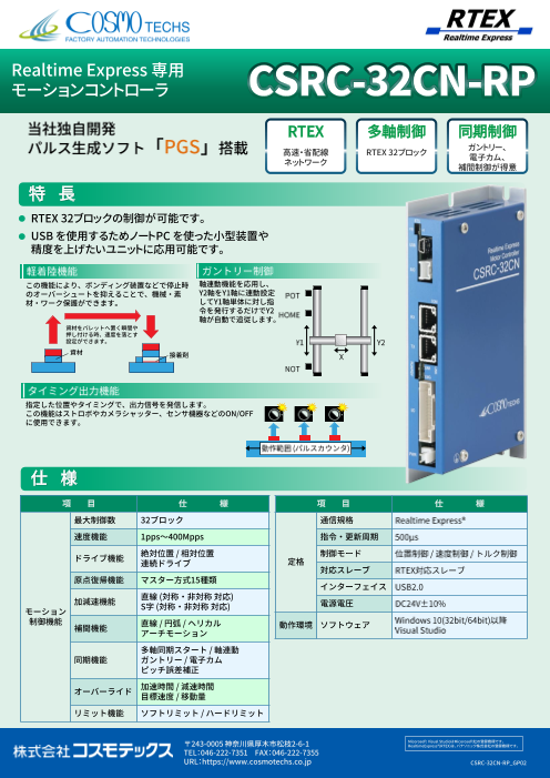 コスモテックスのコア技術であるパルス生成ソフト「PGS」を搭載した、Realtime Express(RTEX)対応 多機能モーションコントロールユニットです。 USB制御タイプのため、ノートPCでの制御が可能です。 そのため、小型装置にも多機能・高...