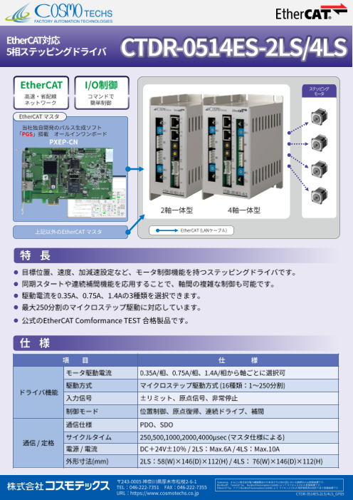 『CTDR-0514ES-2LS/4LS』は、目標位置、速度、加減速設定など、モータ制御機能を持つEtherCAT対応スレーブ、5相ステッピングドライバです。 マスタにはコスモテックス社製Mainデバイス『PXEP-CN』をはじめ、ETG公式テストに合...