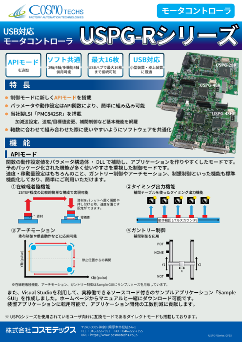 『USPG-Rシリーズ』は、スタンダードな直線・S字状の軸制御から補間制御まで対応した小型・高性能のモータコントローラです。 2軸制御、4軸制御、フィードバックおよびコンパレータ機能付き4軸制御の3機種をラインアップ。いずれも外部通信にはUSB2....
