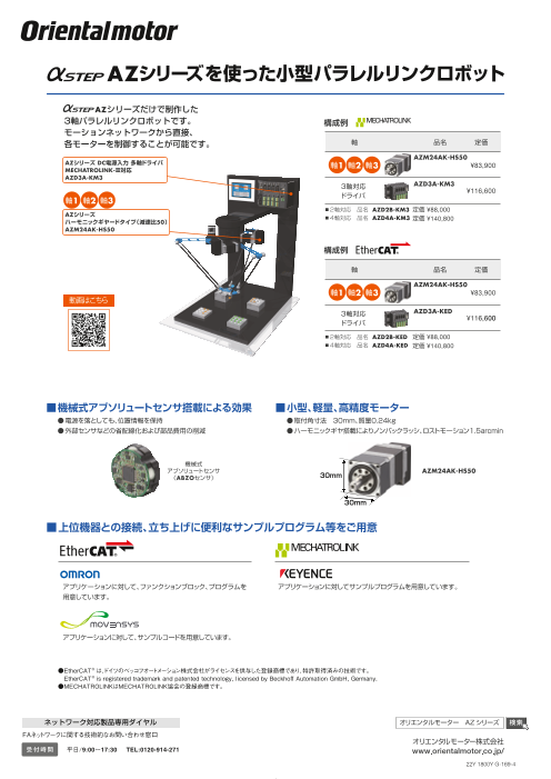 AZシリーズだけで制作した3軸パラレルリンクロボットです。 ■小型、軽量、高精度モーター ・取付角寸法 30mm、質量0.24kg ・ハーモニックギヤ搭載によりノンバックラッシ、ロストモーション1.5arcmin ■機械式アブソリュートセ...