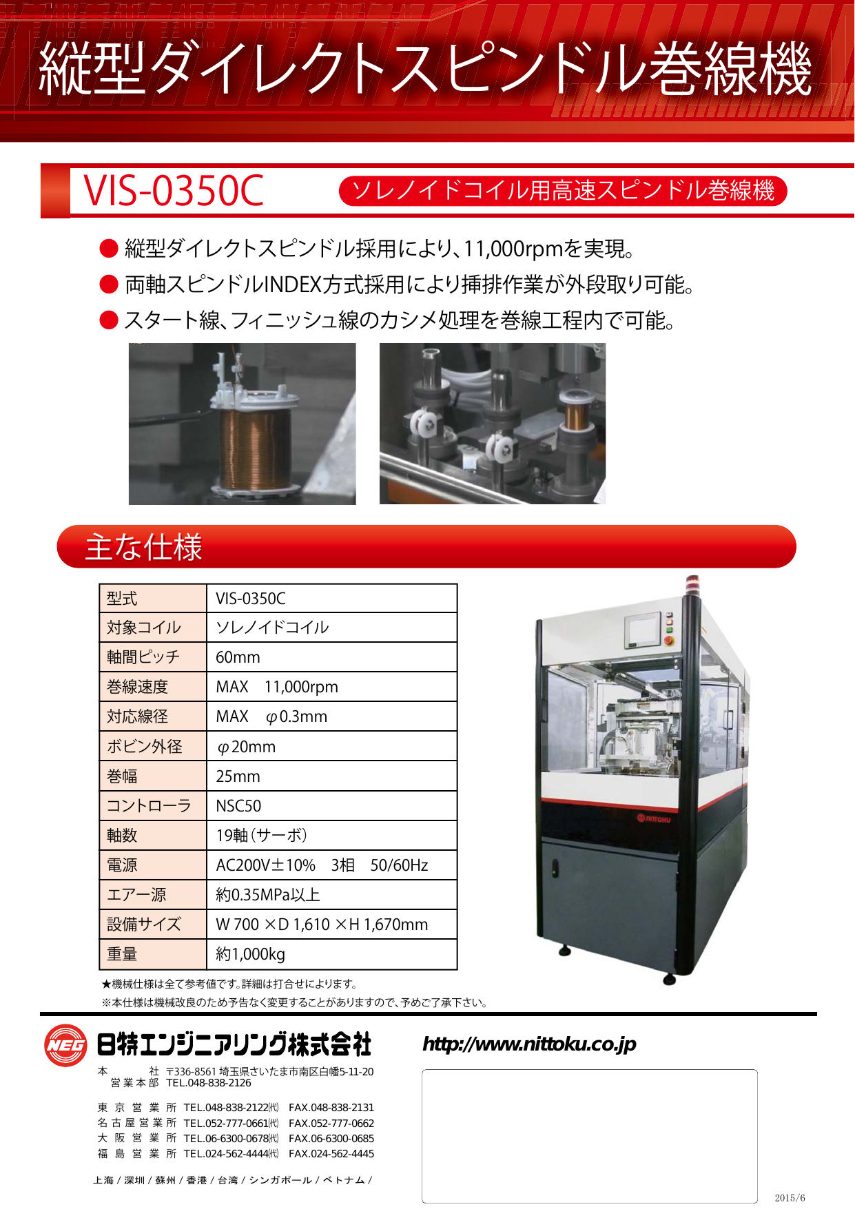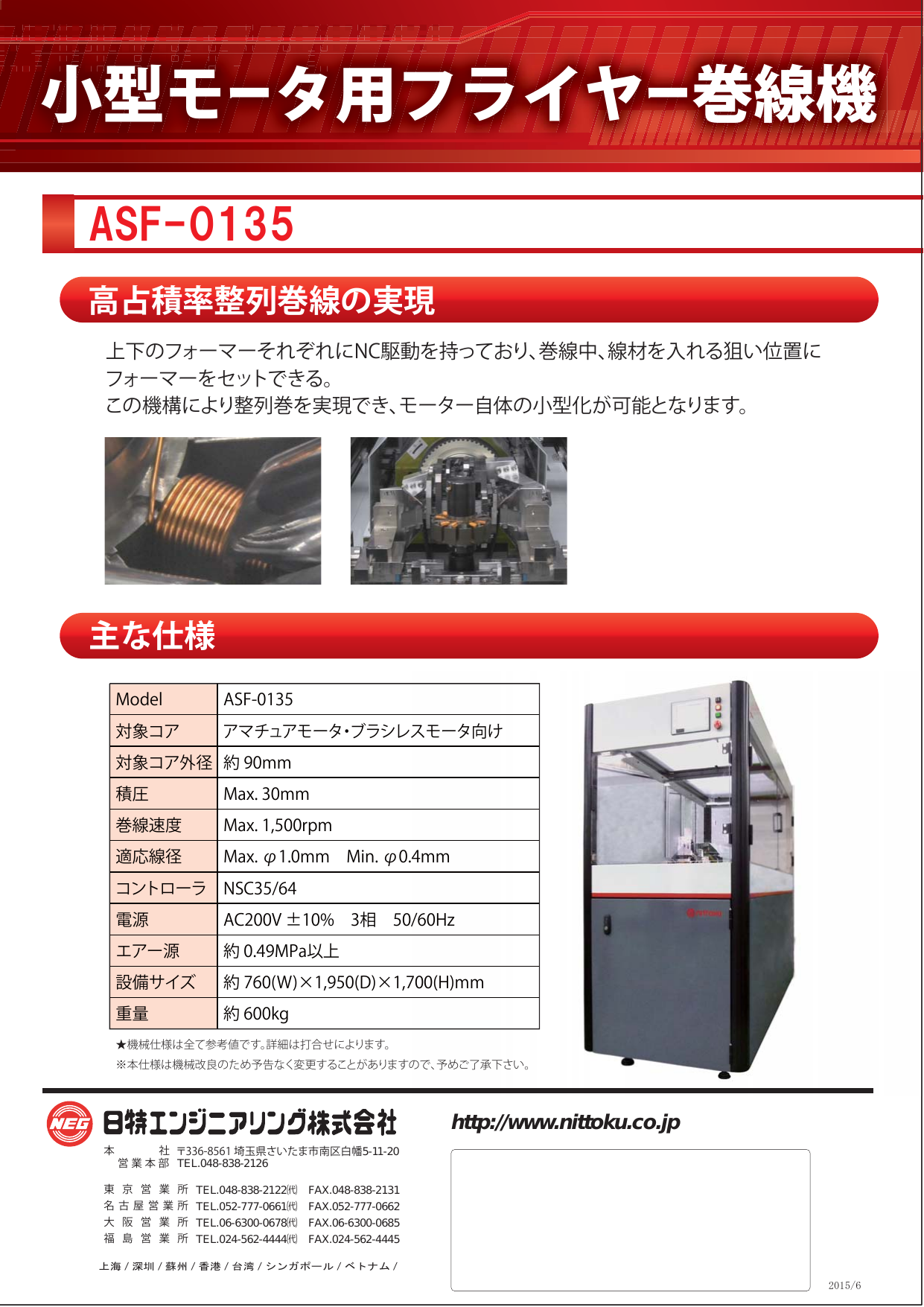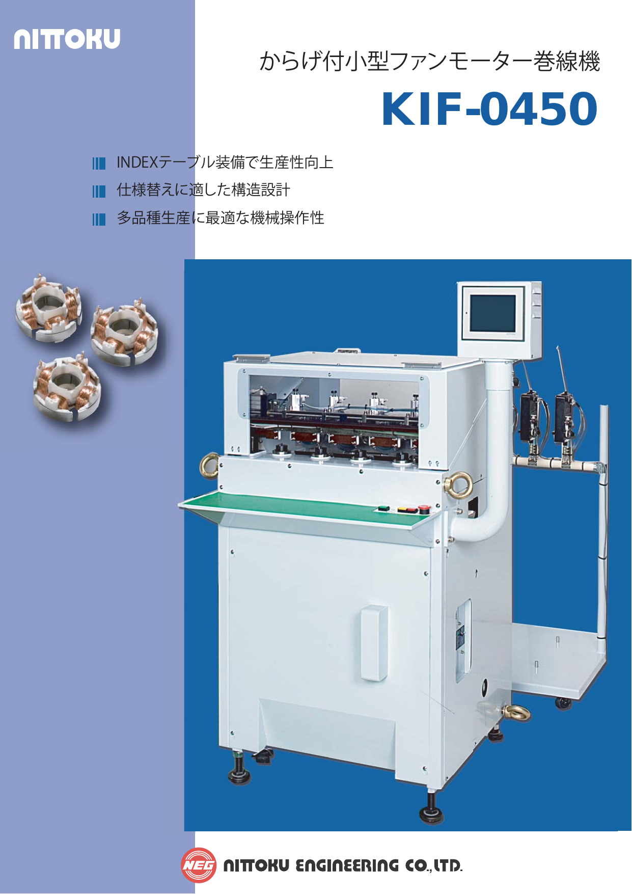 からげ付小型ファンモーター巻線機カタログのご案内です。日特エンジニアリング社特許のINDEXテーブル採用によりタクトアップを実現(日特エンジニアリング社従来機比30%UP)! 蓄積されたノウハウを活かした機械構造と制御システムを採用し、オペレーターの機械...