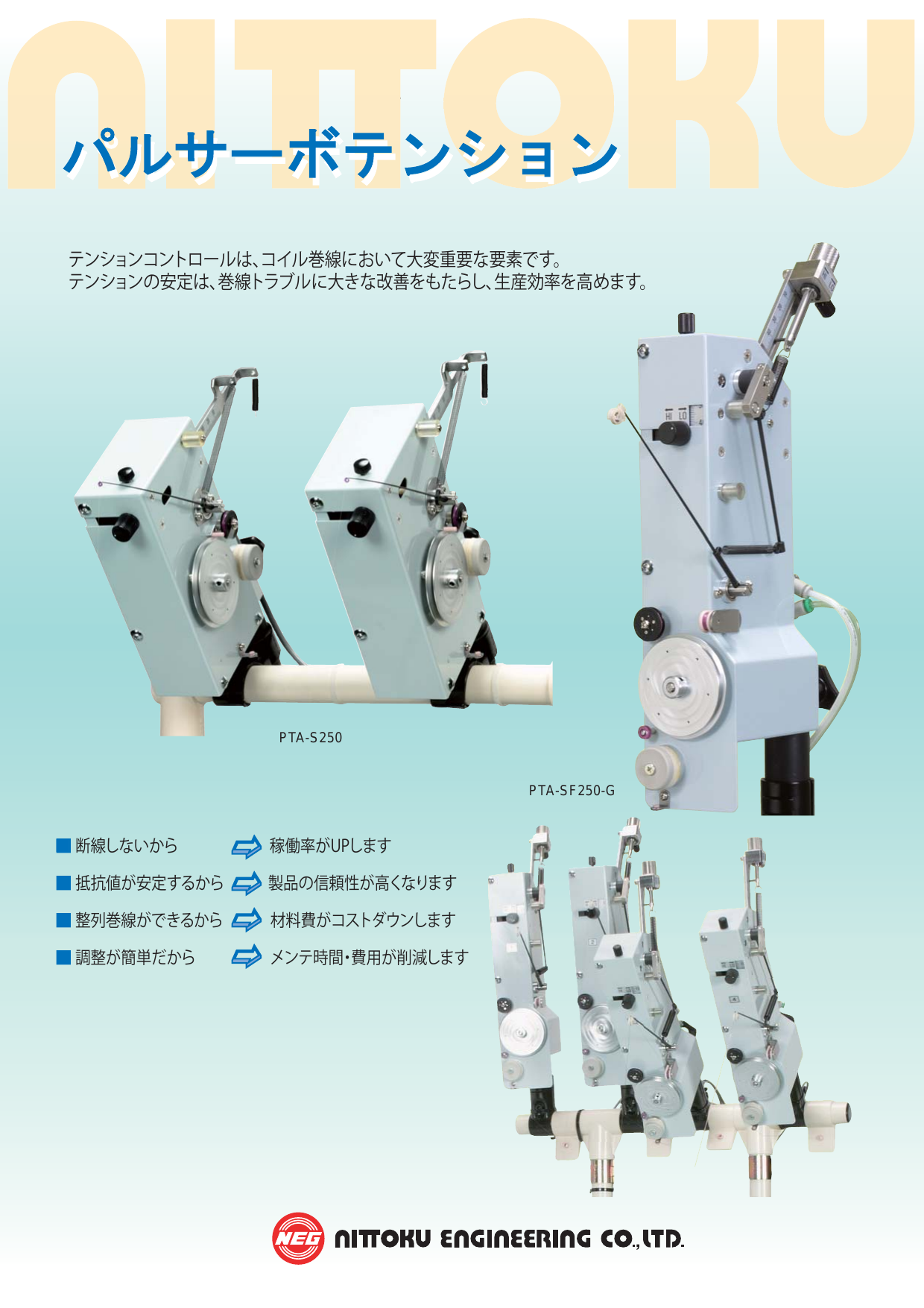 パルサーボテンションカタログのご案内です。日特エンジニアリングの繰り出し方式テンション ”パルサーボテンション”は、サーボテンションと同様の制御方式で線を繰り出すシステムを採用しているので、メカテンション、電気テンションに比べてテンション安定性に大変優れ...