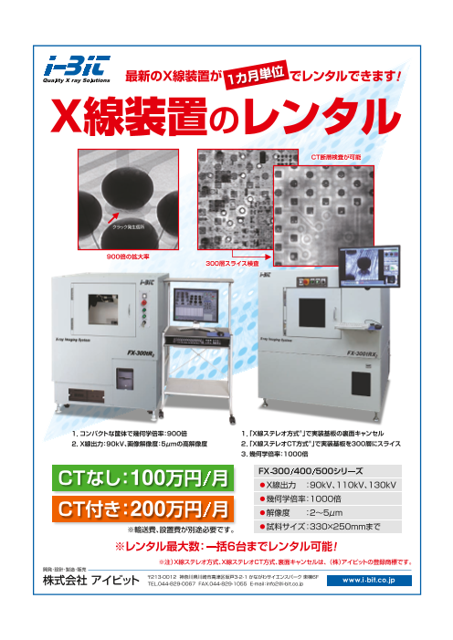 ・X線出力 : 90kV、110kV、130kV ・幾何学倍率:1000倍 ・解像度 :2~5µm ・試料サイズ: 330×250mmまで ※レンタル最大数:一括6台までレンタル可能! ・CTなし: 100万円/月 ・CT付き: 200万...