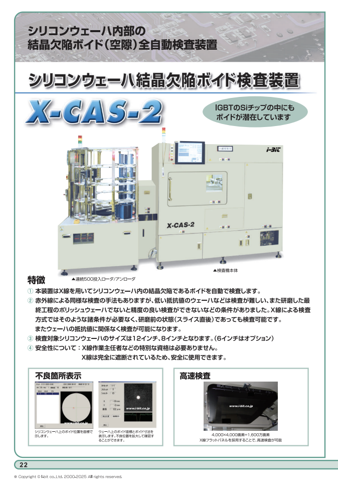 ◆シリコンウェーハ結晶欠陥ボイド検査装置X-CAS-2 ・シリコンウェーハ内部の結晶欠陥ボイド(空隙) 全自動検査装置 ・IGBTのSiチップの中にもボイドが潜在しています ◆X線ウェーハバンプ自動検査装置 Six-3000 ・ウェーハ上のは...