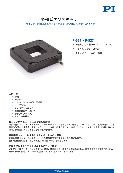 高い動作性をもつP-517およびP-527多軸ピエゾナノポジショニングステージは、XYθZ、XY、およびXYZの構成で、リニアストロークが最大200×200×20μm、回転レンジは最大4mradの範囲での位置決めが可能です。 66×66mmのセンタ...
