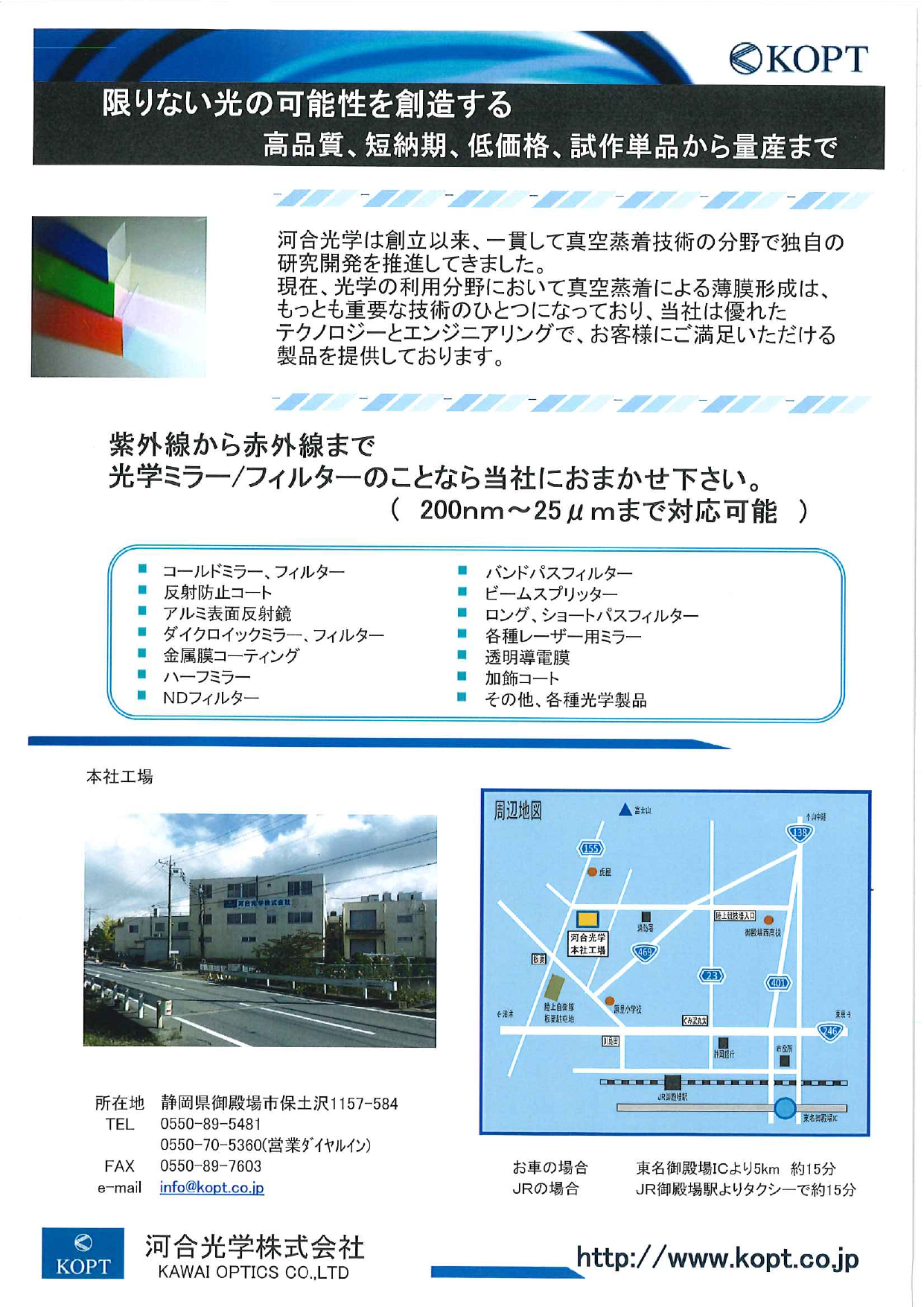 ○真空蒸着・スパッタリンングのしくみ 真空蒸着とは、真空中で金属や酸化物等を電子銃などで加熱し蒸発させ 発生した分子基板表面に堆積させて薄膜を形成させる技術です。 ○光学膜のしくみ 光学膜とは、単層または多層の構成により成り立ち、各層の境界...