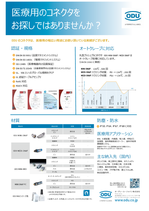 医療用に使用されるODU製品について、 取得認証・規格/オートクレーブ/材質(非磁性など)に関するフライヤーになります。 ODUコネクタは ◆オートクレーブに対応 ◆防水・防塵 ◆非磁性材料のみの使用も対応可能 ◆詳細はカタログをダウ...