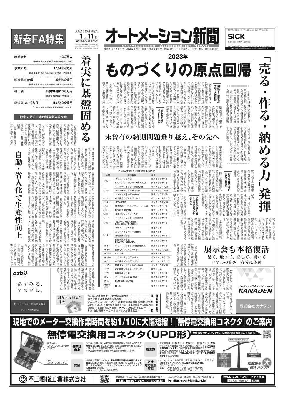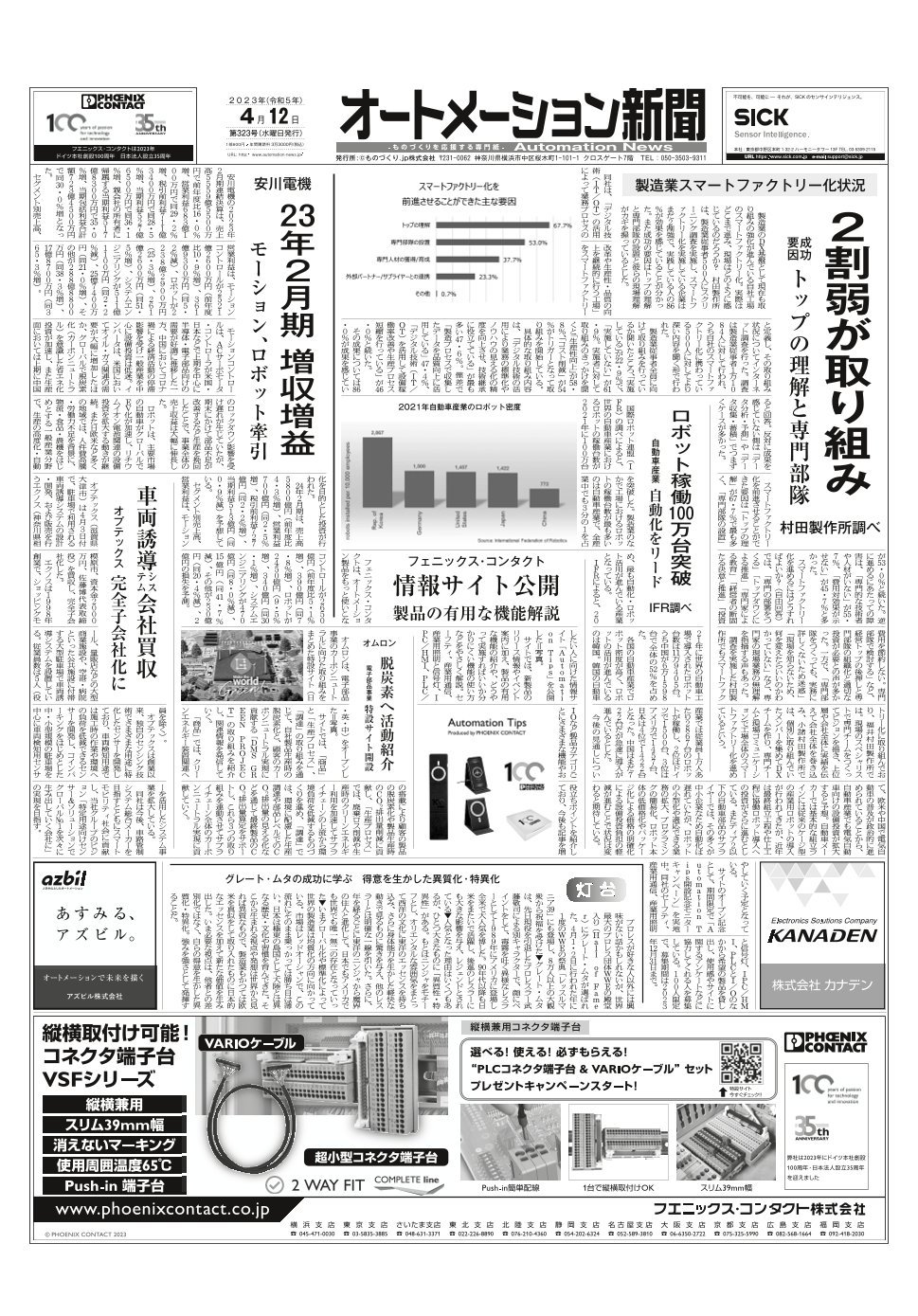 2023年1月11日発行のFA・自動化の専門メディア「オートメーション新聞」PDF版です。 新春恒例 各社トップインタビュー、数字で見る日本の製造業の現在地2023(就業者数・製造品出荷額等 ・事業所数・製造業GDP・輸出額 )、特集記事(エレクトロニ...