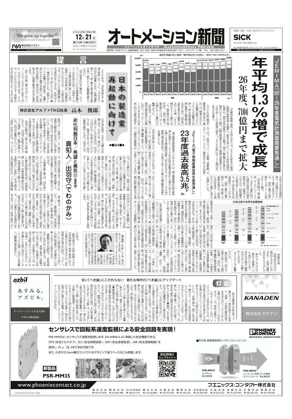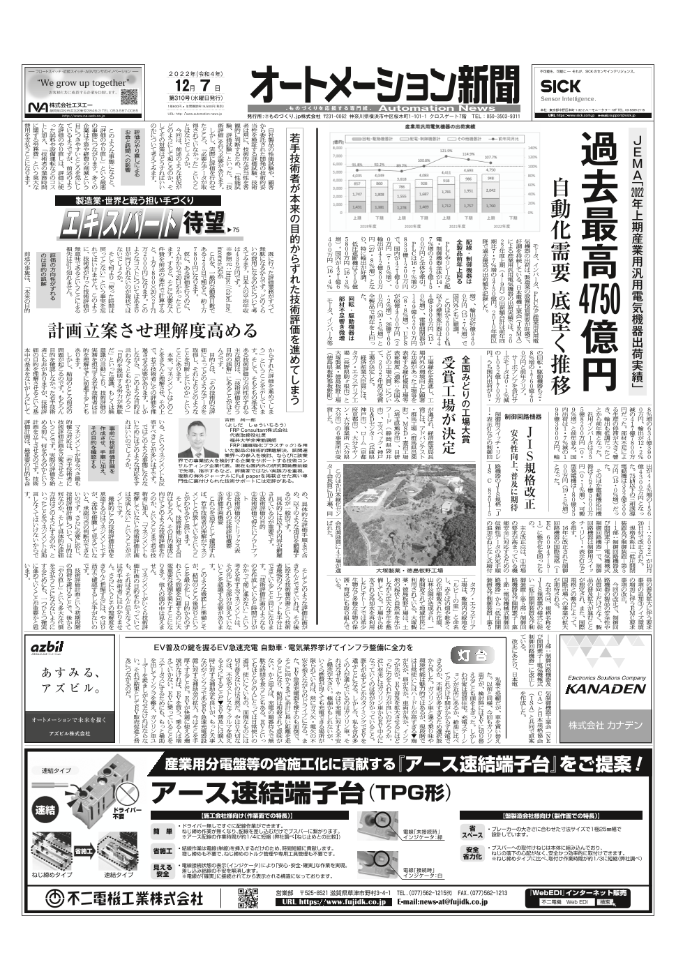 2022年12月7日発行のFA・自動化の専門メディア「オートメーション新聞」PDF版です。 フォスター電機 ハンガリーに車載用スピーカーの製造・販売子会社を設立、三菱電機とシーメンス 12/14〜東京ビッグサイト「セミコンジャパン2022」出展、世界半...