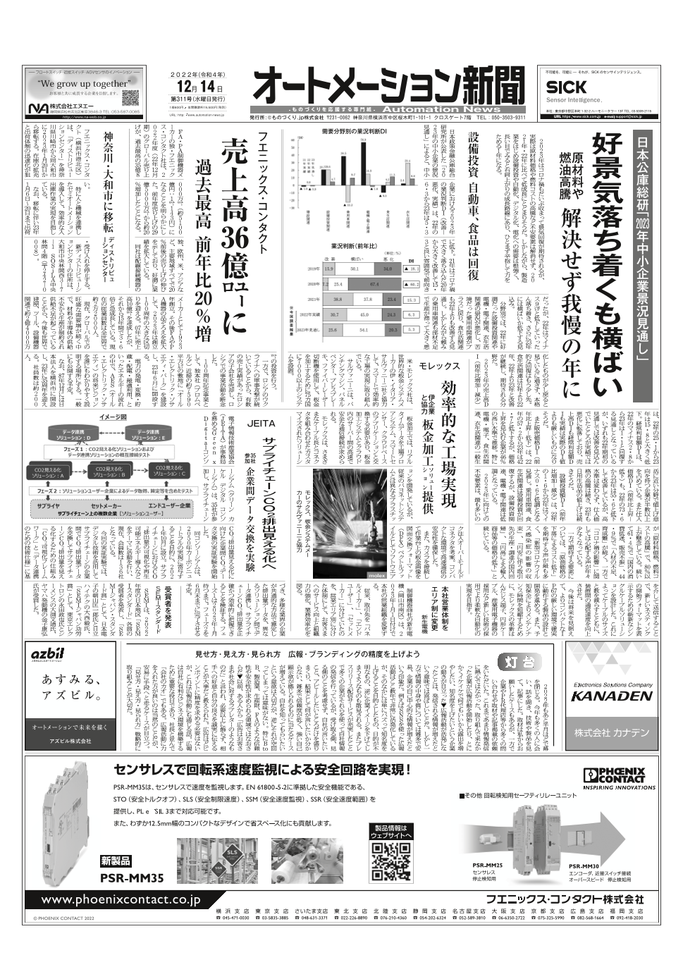 2022年12月14日発行のFA・自動化の専門メディア「オートメーション新聞」PDF版です。 Green x Digital コンソーシアム サプライチェーン CO2排出量見える化に向け企業間データ交換の実証実験35社が参加、新製品・サービス情報(アイ...
