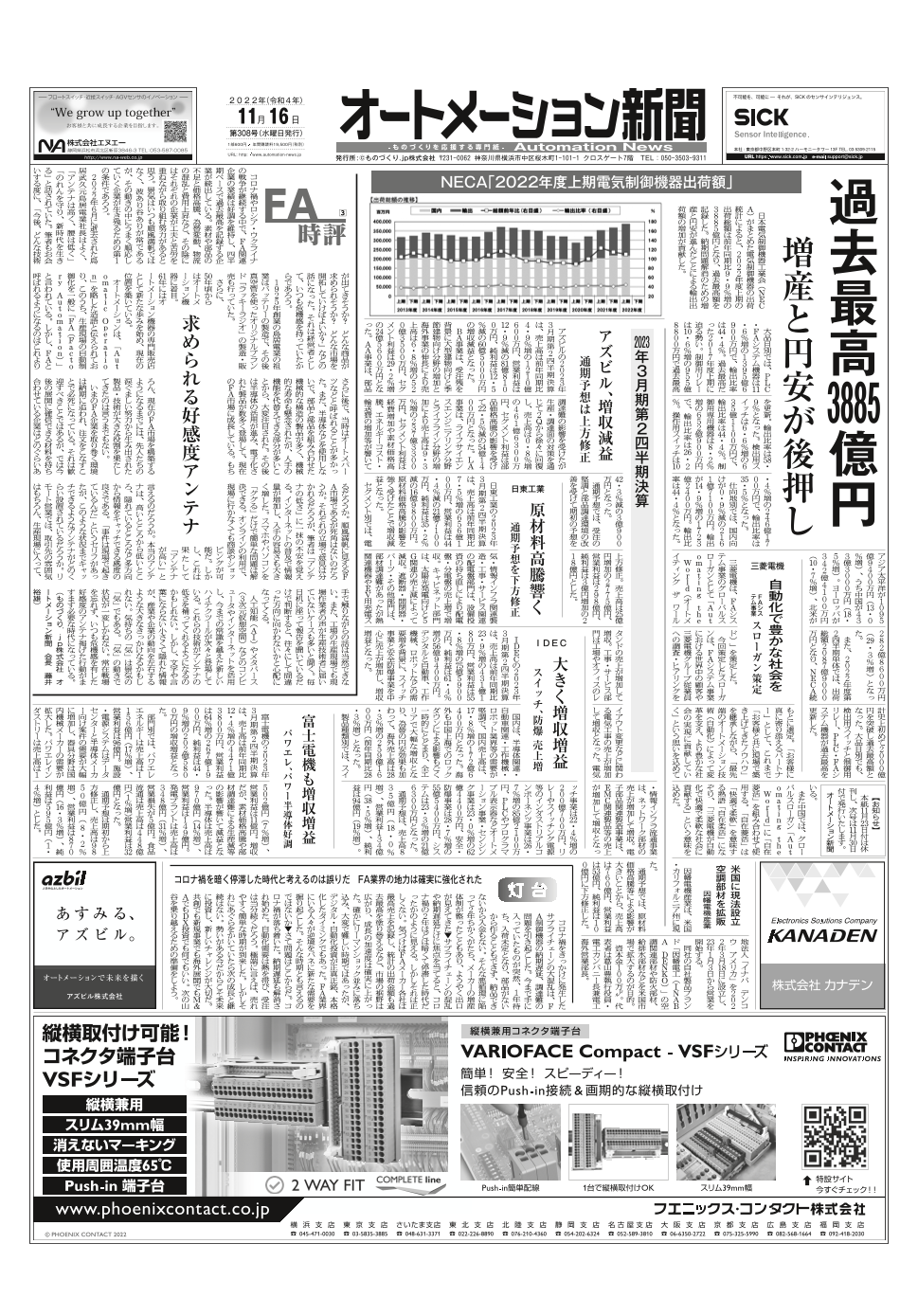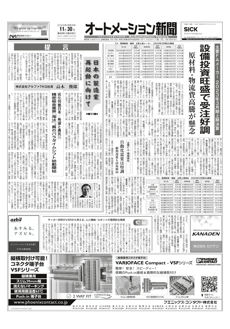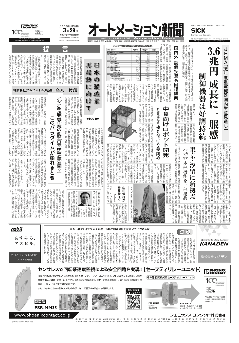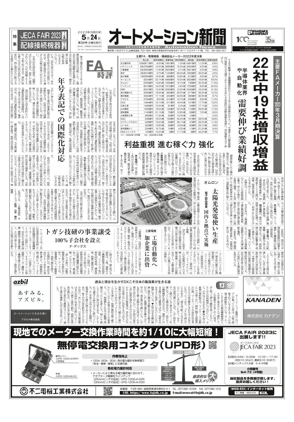 2023年3月29日発行のFA・自動化の専門メディア「オートメーション新聞」PDF版です。 フエニックス・コンタクト 2022年度の特約店表彰としてサンワテクノス表彰、東レ 韓国でPPS樹脂の生産能力を年産5000トン増設、日東工業製EV充電...