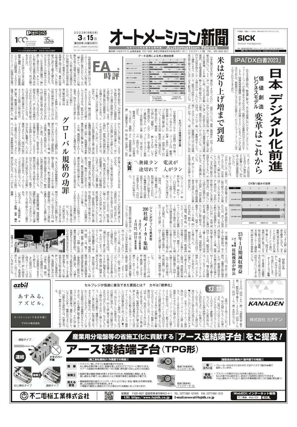 2023年3月15日発行のFA・自動化の専門メディア「オートメーション新聞」PDF版です。 日本能率協会コンサルティング「2023ものづくり川柳大賞」入選作決定、生産中止情報、IPA DX白書2023、日本曹達、千葉工場(千葉県市原市)で半導体フ...