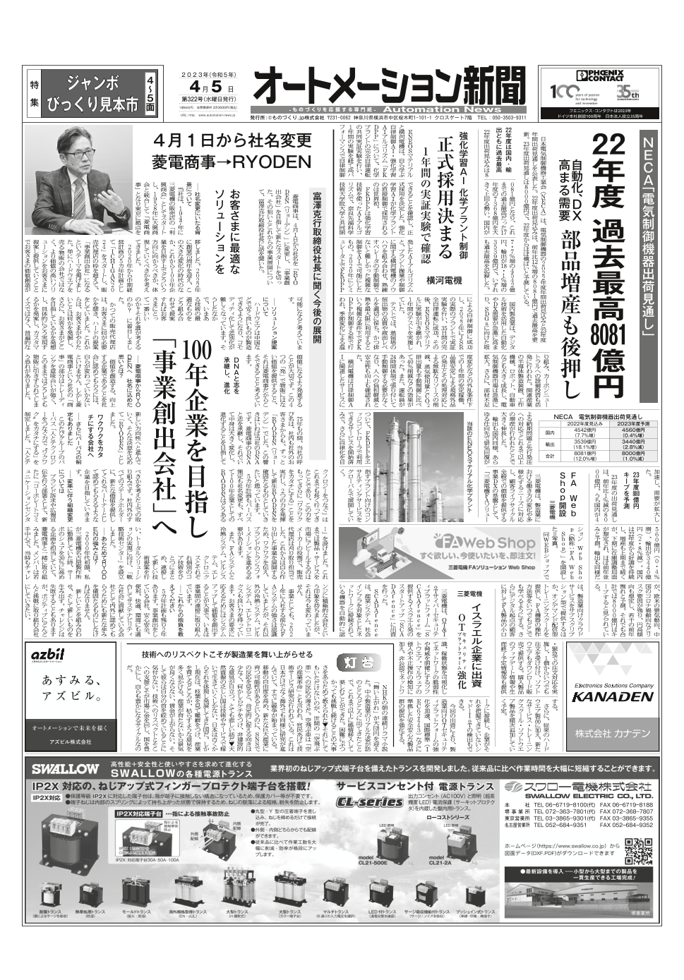 2023年4月5日発行のFA・自動化の専門メディア「オートメーション新聞」PDF版です。 三菱電機 FAソリューションWeb Shopを開設、ジャンボびっくり見本市出展各社の製品紹介、NECA 電気制御機器の出荷見通し、立花エレテック 4/12〜「...