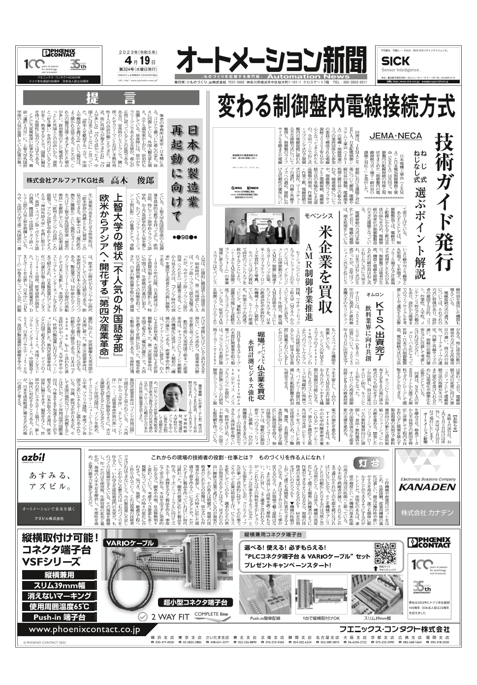 2023年4月19日発行のFA・自動化の専門メディア「オートメーション新聞」PDF版です。 SSC 温度監視の導入負担を軽減する温度異常監視ユニット開発、オムロンベンチャーズ EV充電サービスのユビ電に出資、モベンシス 米のスタートアップ会社買...