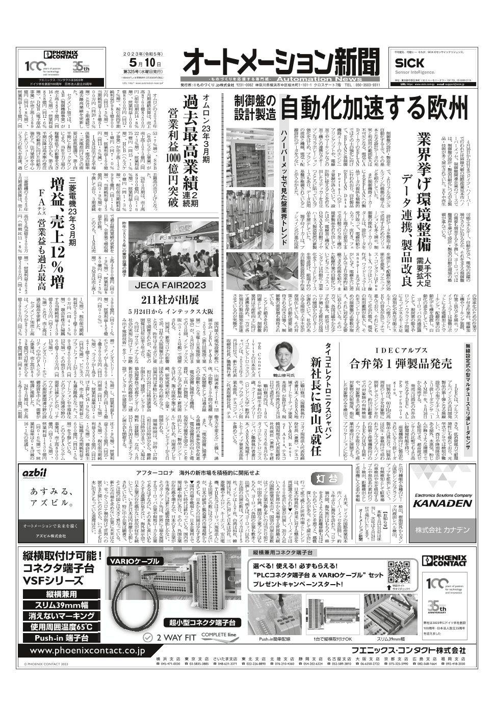 2023年5月10日発行のFA・自動化の専門メディア「オートメーション新聞」PDF版です。 横河電機 サウジアラビアで海水淡水化プラント向け制御システム受注 環境配慮型の逆浸透膜法プラントへの転換に貢献、オムロン 半導体製造プロセス向け温度調節ユニ...