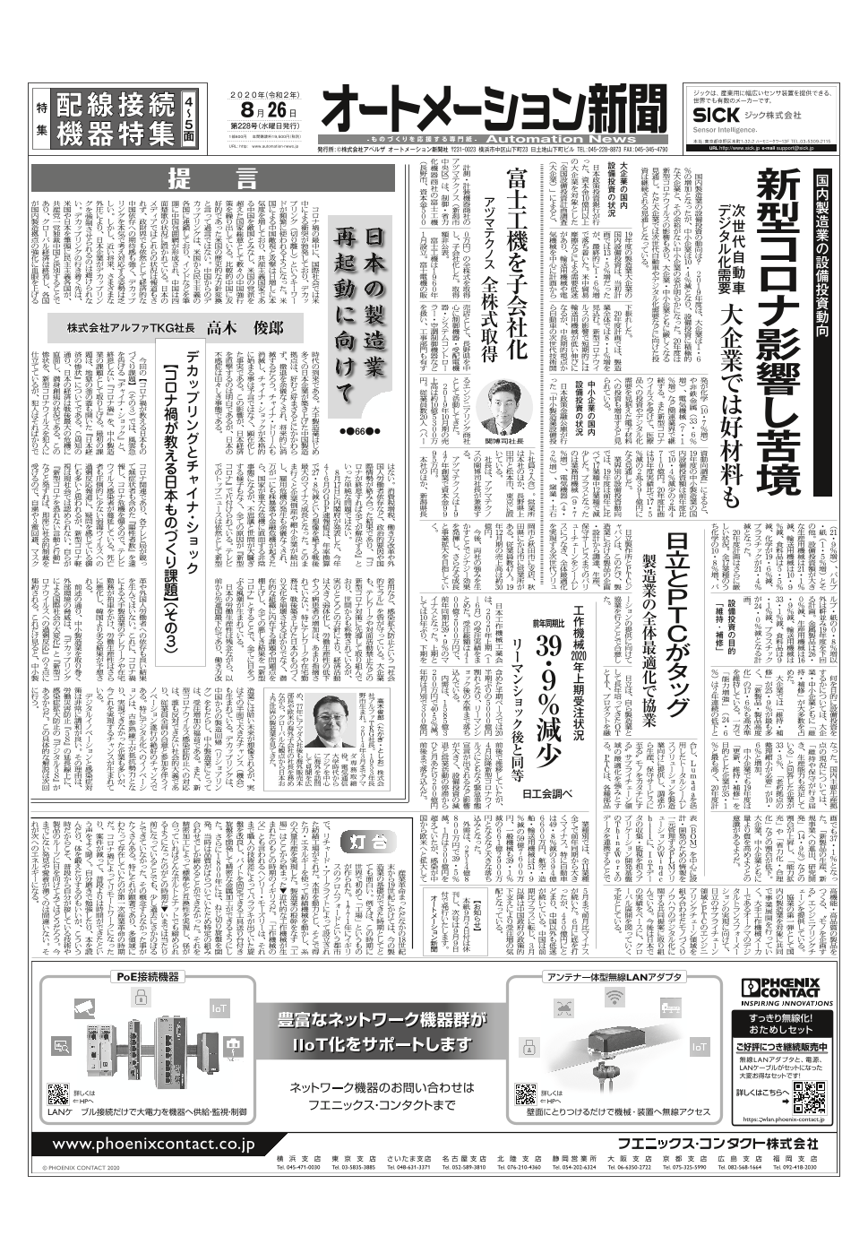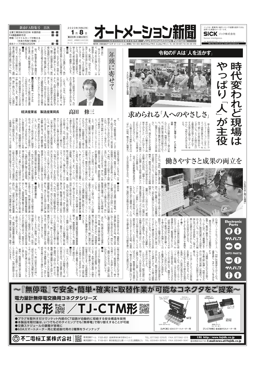 オートメーション新聞2020年1月8日発行号(全22ページ)です。 全編を通じ、「2020年の製造業界・FA業界はどうなるのか?」をテーマに構成 【見どころ】 ①FA・制御機器メーカートップインタビュー 三菱電機やオムロンなど主要FA・制御機...