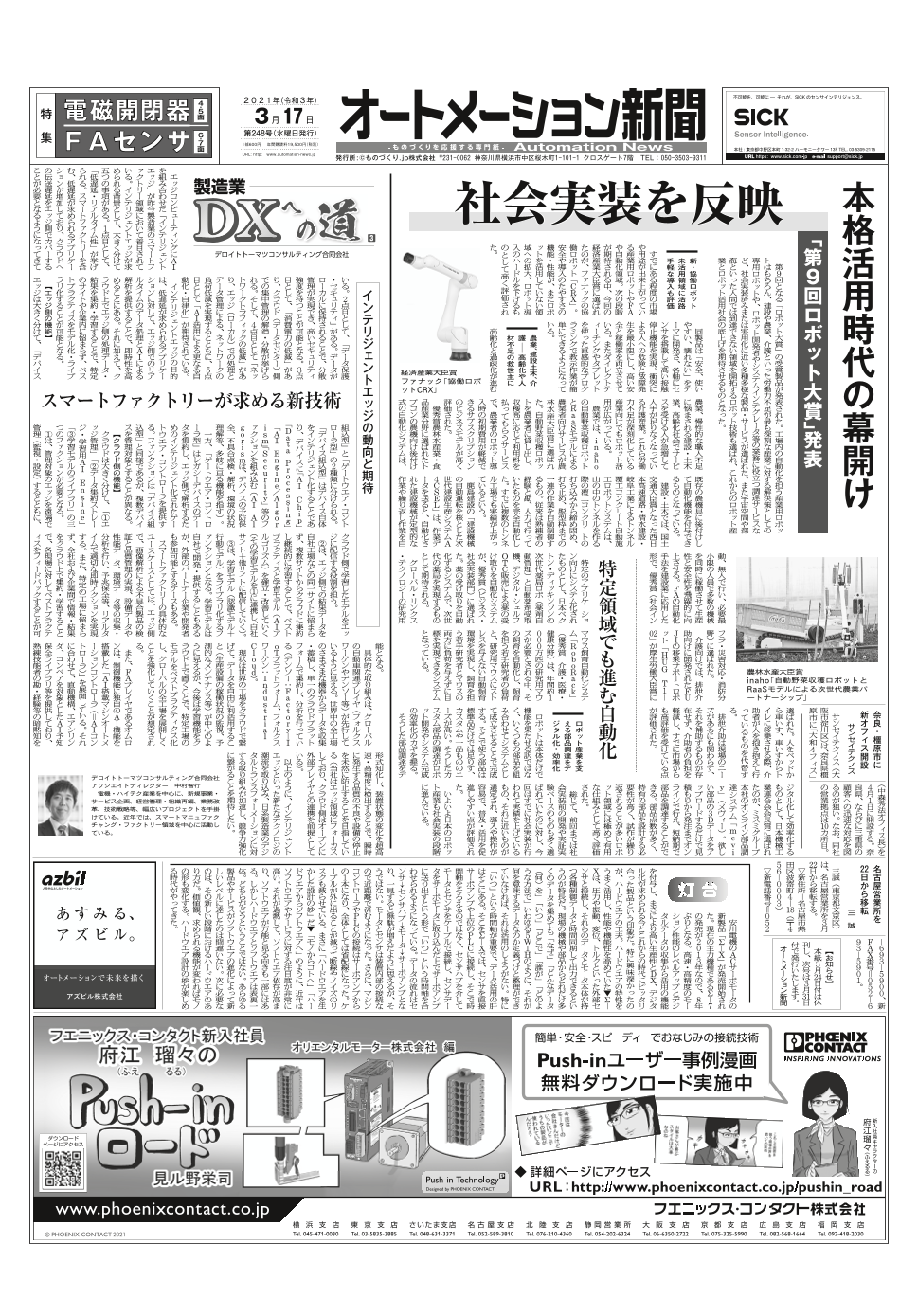 2021年3月17日発行のFA・自動化の専門メディア「オートメーション新聞」PDF版です。ファナックの新型協働ロボットや農業ロボット、建設ロボットなど第9回ロボット大賞の受賞製品から見たロボット産業の現在地や、安川電機の新型サーボモータΣ-XなどFA・自...