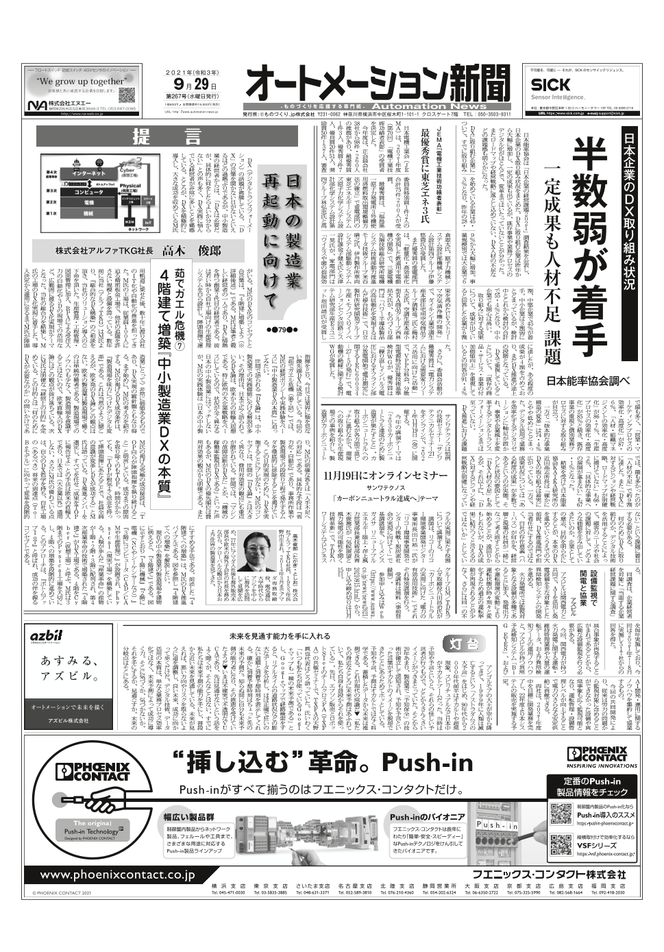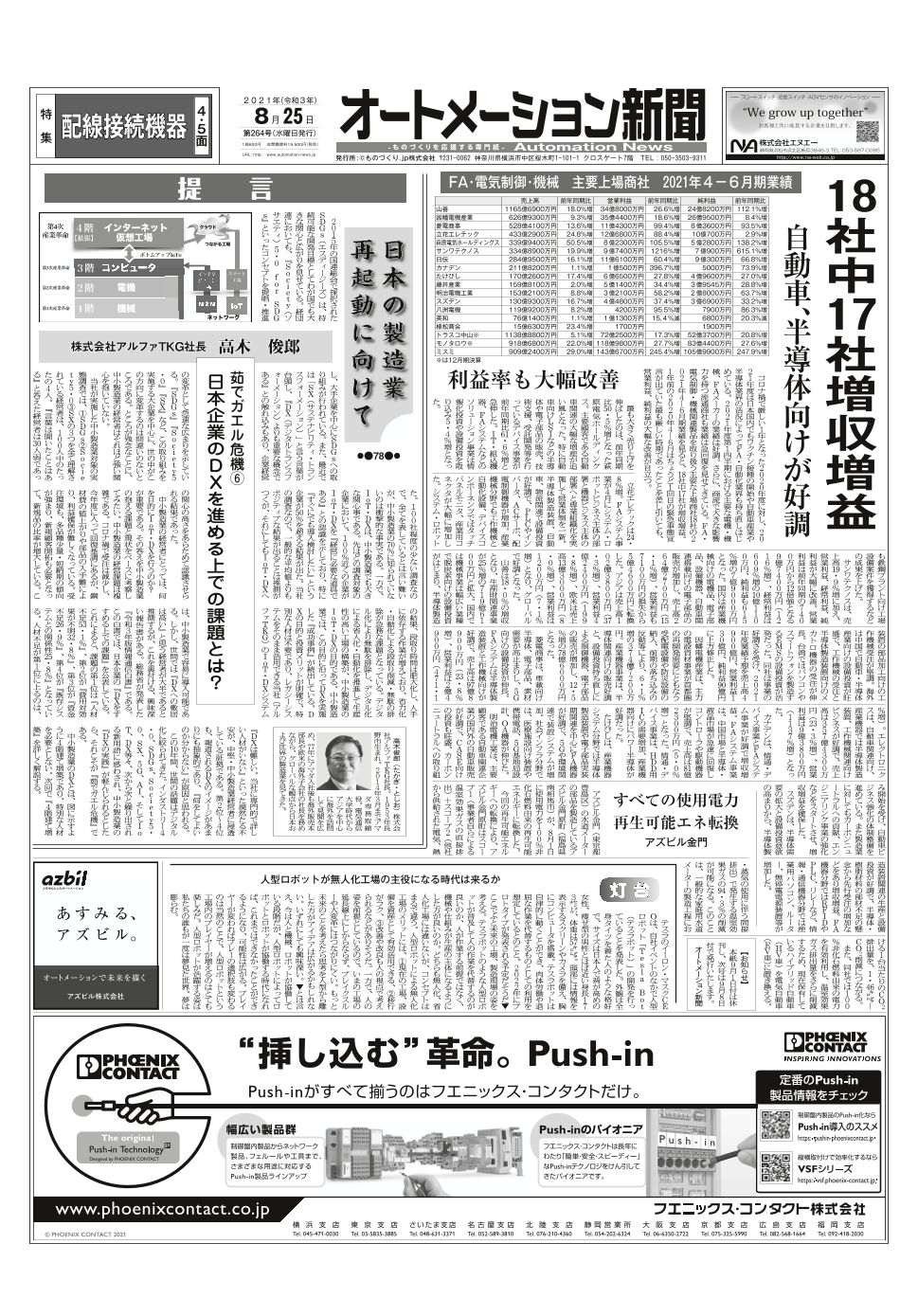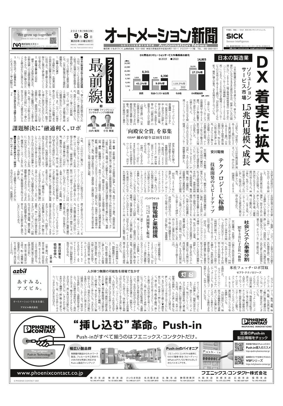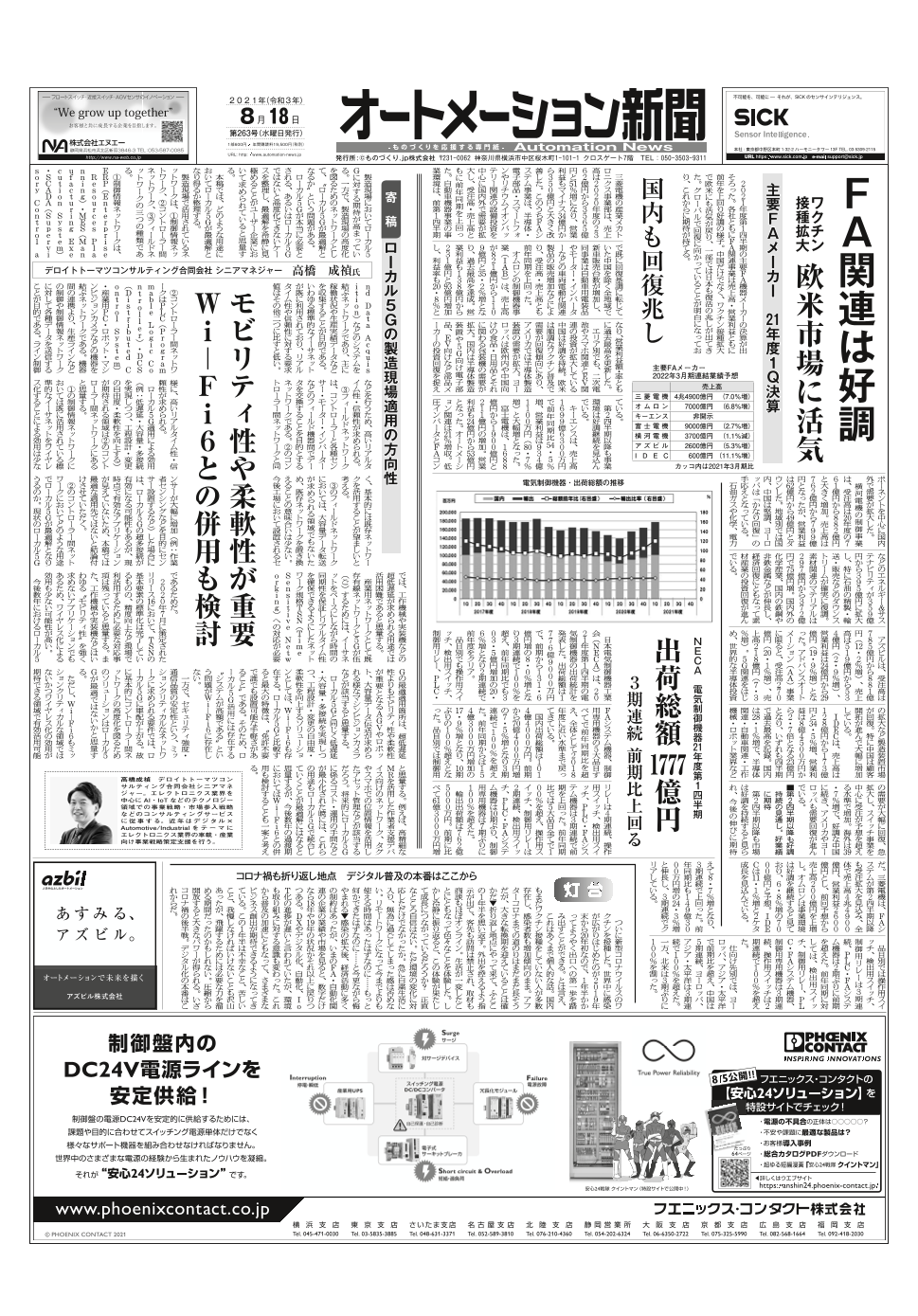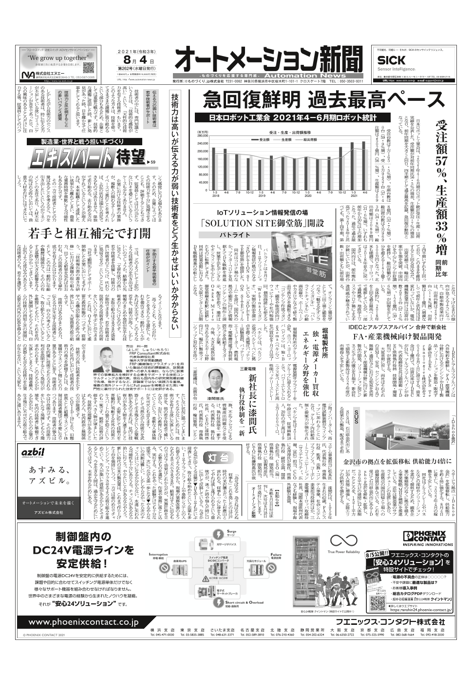 2021年8月4日発行のFA・自動化の専門メディア「オートメーション新聞」PDF版です。 堀場製作所独・電源メーカー買収、シーシーエスソフトバンク5Gコンソーシアムに参画、 スマートコミュニティインフラのISO発行などFA・自動化の最新ニュースを紹介...