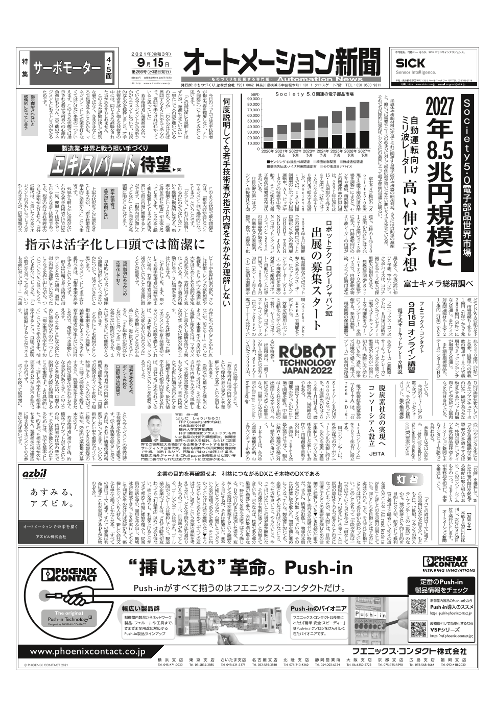 2021年9月15日発行のFA・自動化の専門メディア「オートメーション新聞」PDF版です。 OKI電線 超細径ロボットケーブル・超細径ケーブルを販売開始、シュナイダーエレクトリック 三相UPSにライブスワップ機能搭載モデル追加、フエニックス・コンタクト...