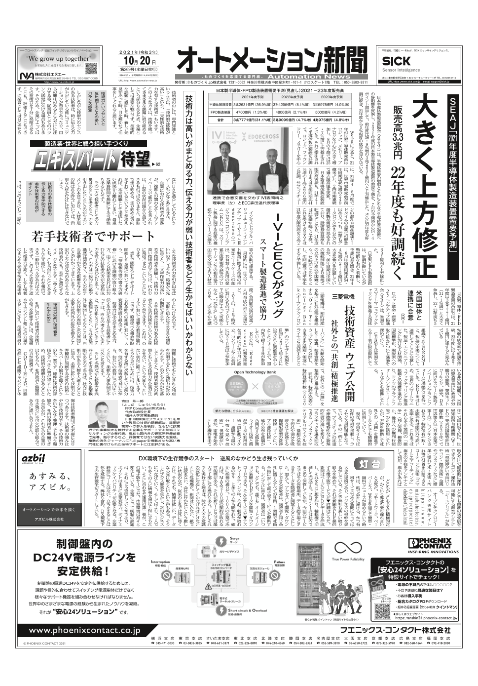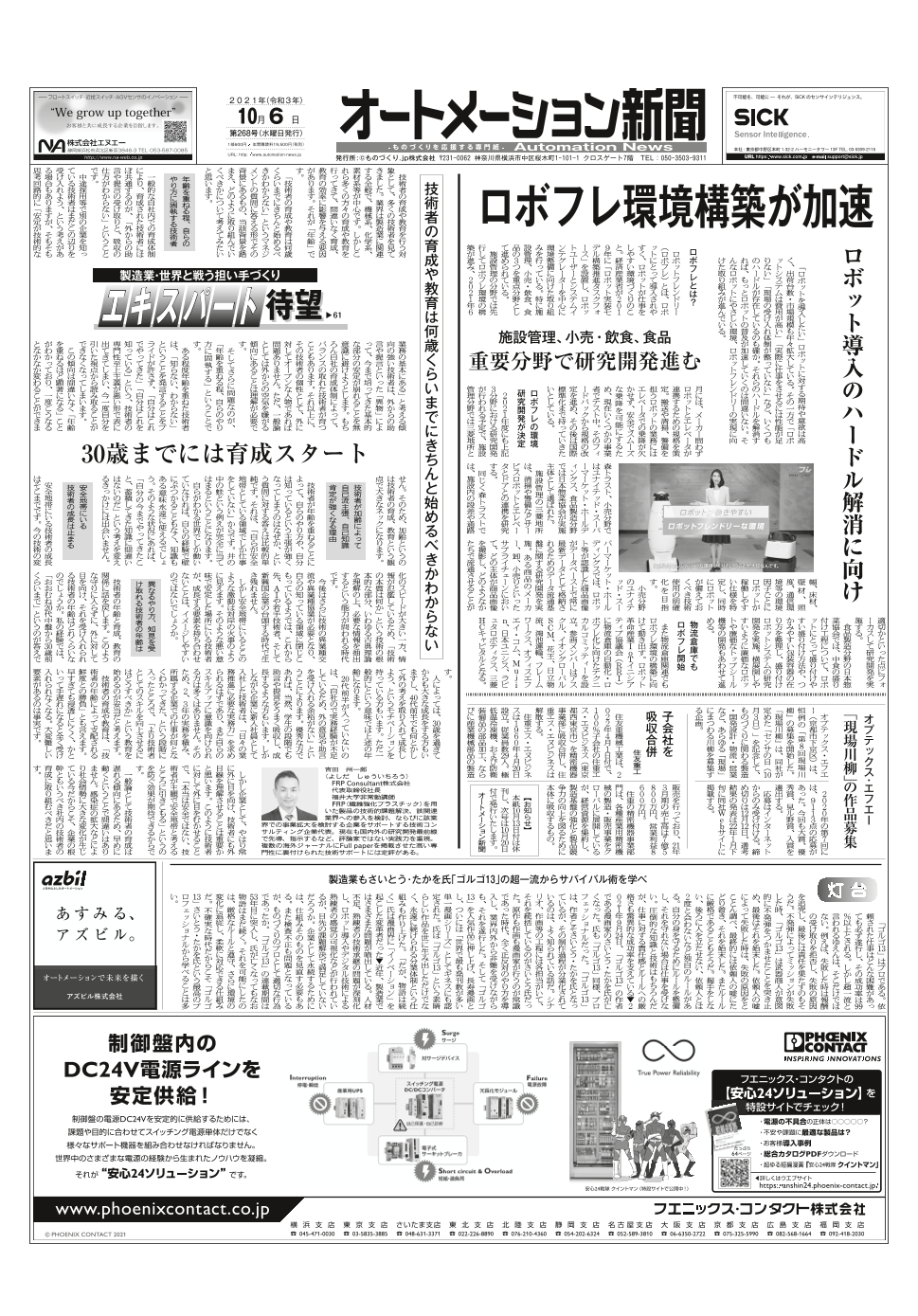 2021年10月20日発行のFA・自動化の専門メディア「オートメーション新聞」PDF版です。 IVIとECCがタッグ スマート製造推進で協力、富士電機 異常診断 PLC活用 生産工程 不良品の流出防ぐ、セーフティシニアアセッサ 12月、初の認証試験、横...