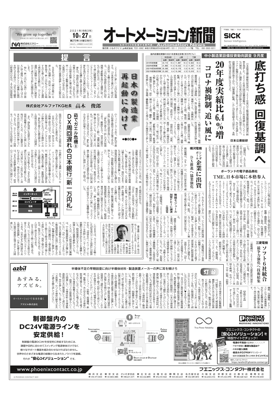2021年9月8日発行のFA・自動化の専門メディア「オートメーション新聞」PDF版です。 横河計測光 スペクトラムアナライザ販売開始、オプテックス・エフエー 印字検査&全画像保存セット特別価格キャンペーン、アマダ 順送プレス加工自動化システム発売開始、...