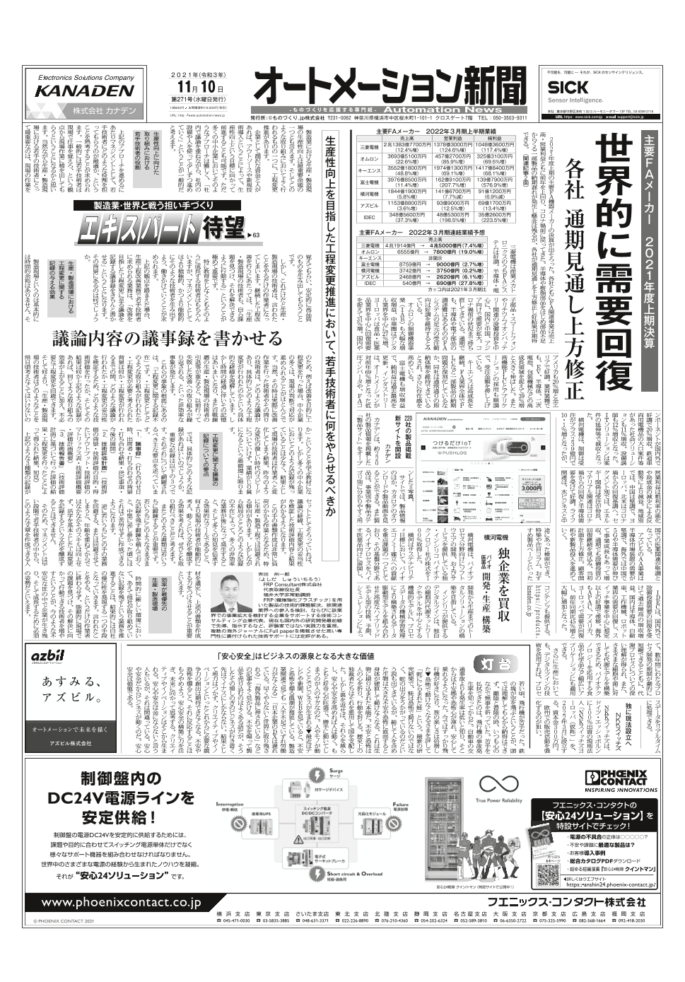 2021年11月10日発行のFA・自動化の専門メディア「オートメーション新聞」PDF版です。 カナデン 220社の製品を掲載した製品サイトを新規オープン、国際ロボット展、2022年3月 リアル・オンラインのハイブリッドで開催、横河電機 独・インシリコ買...