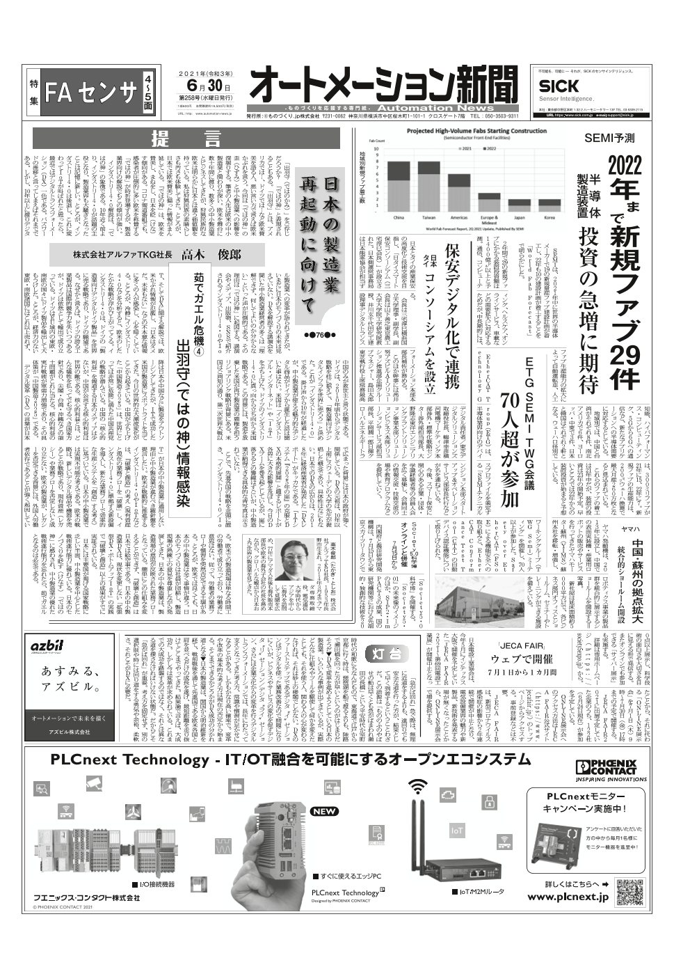 2021年6月30日発行のFA・自動化の専門メディア「オートメーション新聞」PDF版です。 ETG SEMIワーキンググループ会議を開催、日タイスマート保安コンソーシアム設立アズビル エネマネ事業者に8年連続採択、などFA・自動化の最新ニュースを紹介...