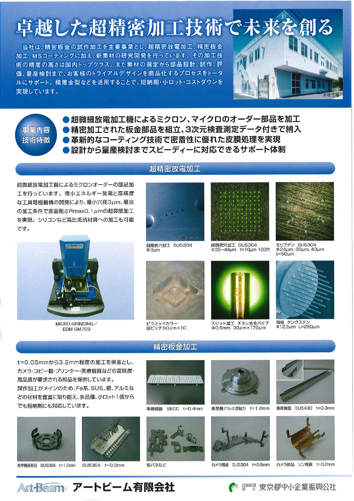 精密板金の試作加工を主要事業とし、新素材の研究開発やトライアルデザインから商品化までのプロセスをトータルにサポートしているアートビームの会社案内です。 当社の技術特徴である超精密放電加工、精密板金加工、組立・3次元測定、MSコーティングを紹介しています...