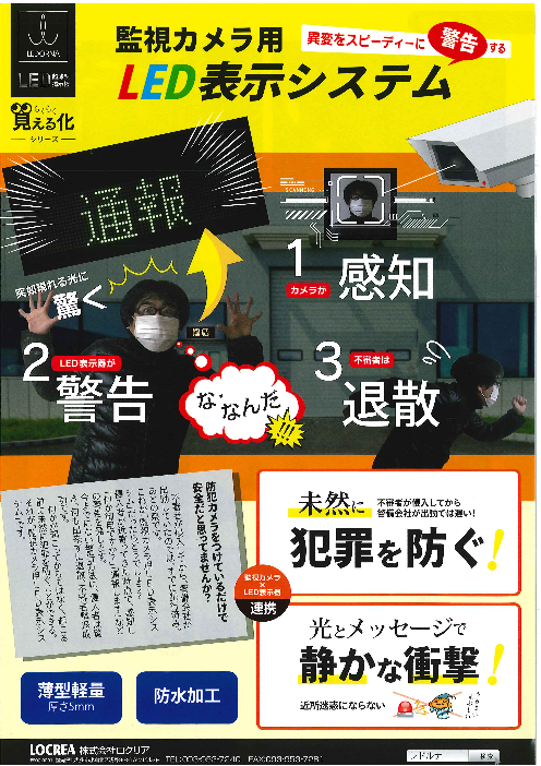 1.カメラが「感知」 2.LED表示器が「警告」 3.不審者は「退散」 ◆未然に不審者が侵入してから警備会社が出勤してからでは遅い! 犯罪を防ぐ! ◆光とメッセージで静かな衝撃!近所迷惑にならない ◆詳細はカタログをダウンロードしてご...