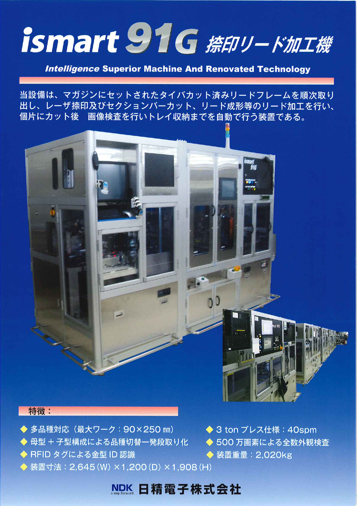 マガジンにセットされたタイバーカット済みリードフレームを順次取り出し、レーザー捺印及びセクションバーカット、リード成形等のリード加工を行い、個片にカット後、印字およびリード外観の画像検査を行い、トレイ収納までを自動で行う装置です。リードフレーム幅90mm...