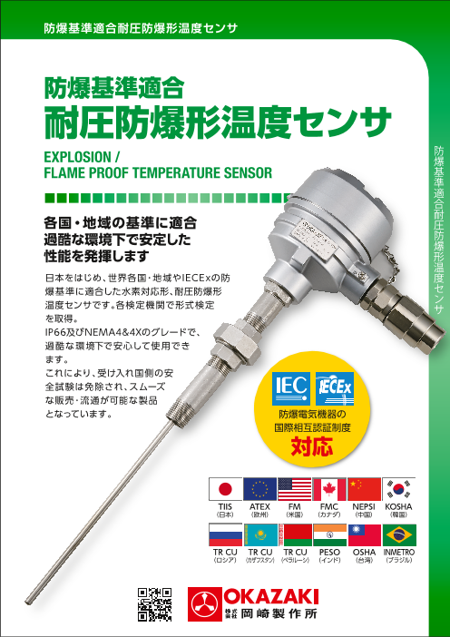 IECExをはじめ、世界各国・地域の防爆基準に適合した耐圧防爆形温度センサです。 シース測温抵抗体のほか、スプリング可動式にも対応しています。 単体の温度センサとして、各地域の耐圧防爆検定に合格した温度伝送器または端子箱を組み合わせてご使用いただけま...