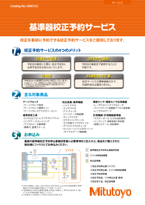 校正予約サービスの4つのメリット ・計画的な管理 予約日が確定した際に、校正予定日と出荷予定日をお知らせいたします。 ・効率的な運用 予約日の直前まで使用することが可能です。 ・短納期 予約日より5営業日以内に校正いたします。 ※品目によっ...