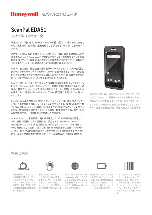 ハネウェルのScanPal EDA51モバイルコンピュータは、真に最適な製品です。高速なQualcomm(R) Snapdragon(TM) SDM450プロセッサと強力なワイヤレス通信機能を備えており、作業員は必要なときに重要なビジネスアプリと情報にア...