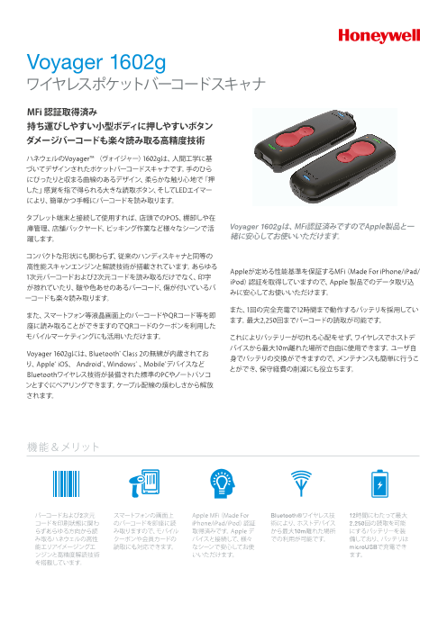 ハネウェルのVoyager™ (ヴォイジャー)1602gは、人間工学に基づいてデザインされたポケットバーコードスキャナです。手のひらにぴったりと収まる曲線のあるデザイン、柔らかな触り心地で「押した」感覚を指で得られる大きな読取ボタン、そしてLEDエイマー...
