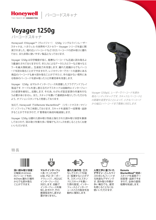 Voyager1200gは、物体検知機能、自動スタンド検知機能の強化は勿論、何よりも読み取り性能に注力して開発されたハンドレーザースキャナーです。 印字精度の低いもの、色褪せたバーコードやダメージバーコードの読み取りに抜群の性能を発揮し、作業の効率化を...