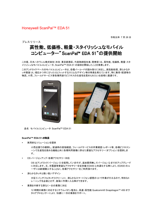 この度、日本ハネウェル株式会社(本社:東京都港区、代表取締役社長:西巻宏)は、高性能、低価格、軽量・スタイリッシュなモバイルコンピュータ、ScanPal™ EDA 51 の提供を開始したことを発表します。 このアンドロイドベースのモバイルコンピュー...