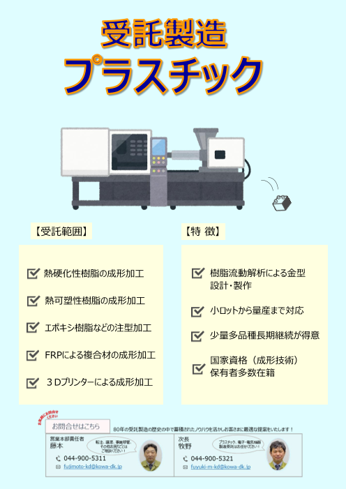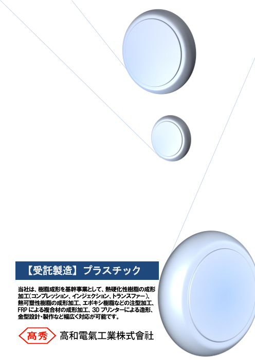 当社は、樹脂成形を基幹事業として、熱硬化性樹脂の成型加工(コンプレッション、インジェクション、トランスファー)、熱可塑性樹脂の成型加工、エポキシ樹脂などの注型加工、 FRP による複合材の成形加工、3Dプリンターによる成形加工、金型設計・製作など幅広く対...